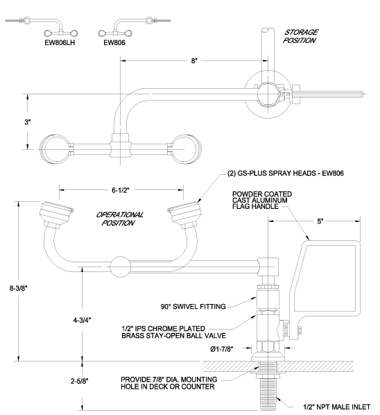 Deck mounted eye wash w/ two gentle spray outlet heads, stay-open ball valve, and 90o swivel feature (Right hand mounting)