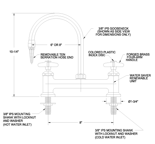 Deck mounted laboratory faucet with 6″ or 8″ rigid gooseneck