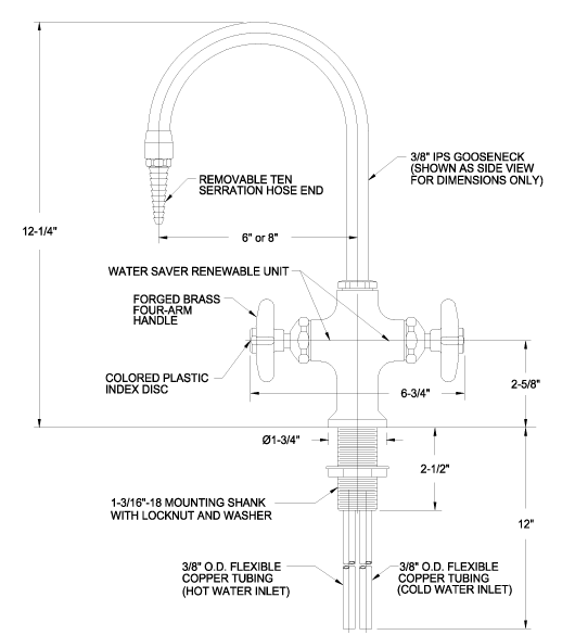 Deck mounted laboratory mixing faucet with 6″ swing gooseneck